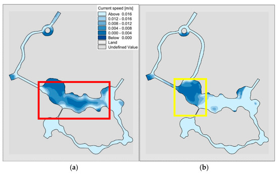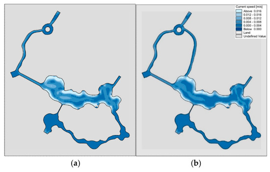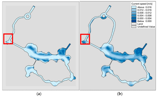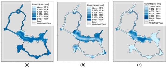 Based on the constructed playground lake water mathematical model, the flow field in the lake area under no water diversion, pump diversion 30 h and sluice diversion conditions were calculated respectively (Figure 8a–c).