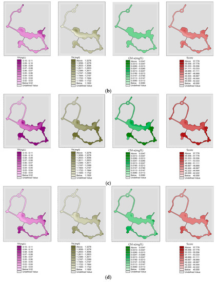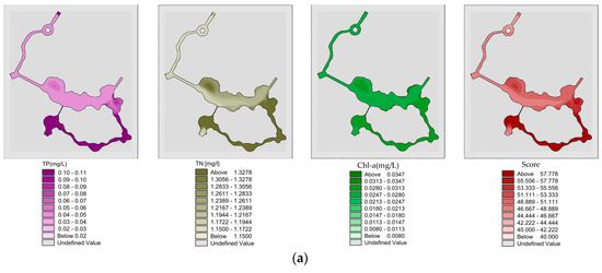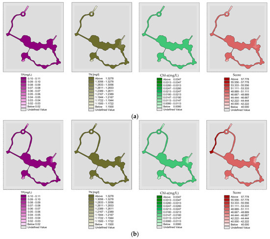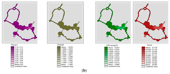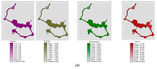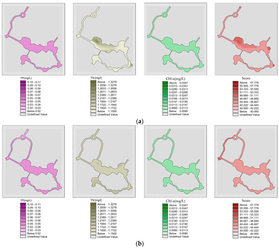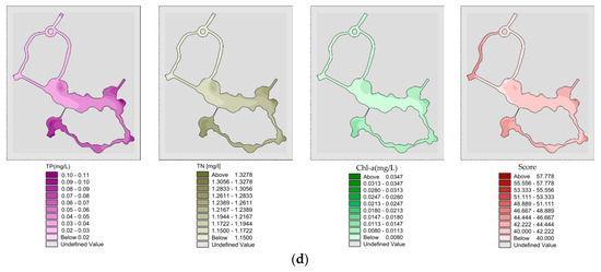 Based on the TN, TP and Chl-a predicted concentrations calculated by the model, the assessment is made according to the current domestic lake eutrophication score and classification criteria as stipulated in the “Assessment Methods of Surface Water Environmental Quality”. The monthly eutrophication scores are given in Table 7. The table shows that throughout the year there was mild eutrophication in June to October, of which the most serious occurred in August.