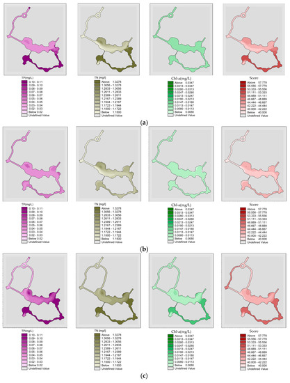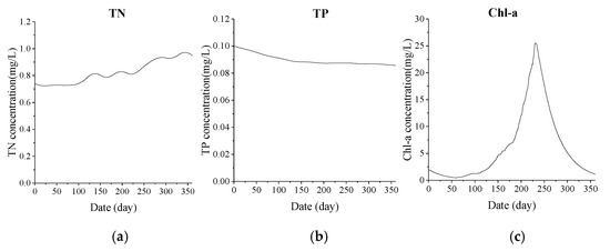 Predicted value of TN, TP, Chl-a concentration throughout whole year. (a) TN concentration; (b) TP concentration; (c) Chl-a concentration.