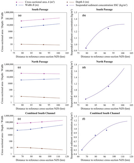 The computed topography and SSC distribution for the South Passage (a,b), North Passage (c,d), and the combined South Channel (e,f) on 13–14 February 2006, compared to observations. (Scatters represent observations, and the drawn lines represent the simulated values).