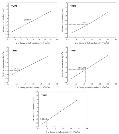 The upper boundary of the TMZ has been widely used to evaluate the location variation of the TMZ under the influence of human activities [25,27]. In this study, we used the upper limit of the TMZ during the pre-TGD period (with the corresponding critical SSC) to quantify the environmental flows needed to maintain the location of current TMZ.