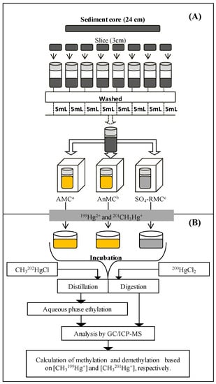 Illustration of the process for the isolation of microbial communities (A) and subsequent incubation with isotope-enriched Hg species to evaluate microbial potential to methylate and demethylate mercury (B). CH3201Hg degradation and CH3199Hg production were monitored using gas chromatography and inductively coupled plasma mass spectrometry (GC/ICP-MS) analysis.