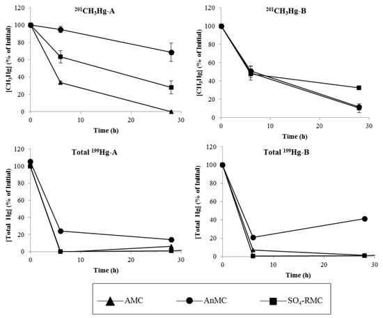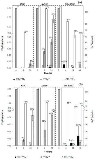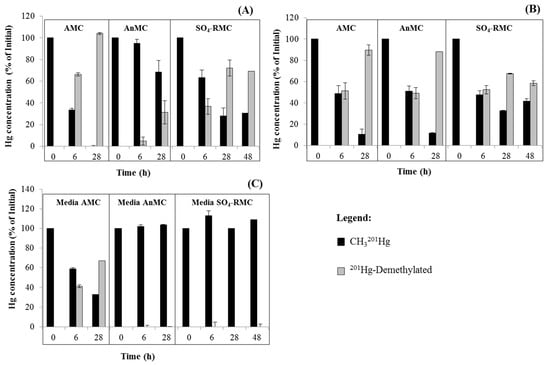 The CH3201Hg concentration decreased during incubation (Figure 2, Figure 3 and Figure 4). This decrease was more accentuated in media containing the AMC from Cala do Norte, where only 0% to 10% of the initial CH3201Hg added to media remained after 28 h.