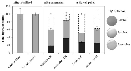Final balance of total mercury after incubation of aerobic and anaerobic microbial communities isolated from two areas of the Tagus estuary (CN—Cala do Norte and B—Barreiro) with HgCl2 for 48 h. The graphic representation shows the percentage of Hg0 volatilized and total mercury remaining in the cell pellet and supernatant. Hg0 volatilization was detected by the foggy area resulting from the reaction between Hg0 and Ag using an X-ray film.