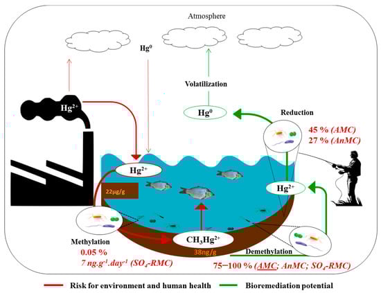 The concentration and bioaccumulation of MeHg in aquatic environments depends on the balance between both methylation and demethylation processes. In the aquatic environment, these two processes are typically microbially mediated and occur mostly in sediments [,]. The rate of these processes is a function of the microbial activity and the concentration of bioavailable mercury species. Thus, the integrated study of these two simultaneous processes is important to understand the dynamics of production and degradation of MeHg, which is critical for future remediation management in contaminated environments.