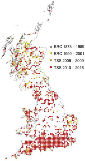 - Pietzsch, M.E.; Medlock, J.M.; Jones, L.; Avenell, D.; Abbott, J.; Harding, P.; Leach, S. Distribution of Ixodes ricinus in the British Isles: Investigation of historical records. Med. Vet. Entomol. 2005, 19, 306–314. [Google Scholar] [CrossRef] [PubMed]