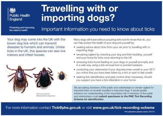 - Hansford, K.M.; Phipps, L.P.; Cull, B.; Pietzsch, M.E.; Medlock, J.M. Rhipicephalus sanguineus importation into the UK: Surveillance, risk, public health awareness and One Health response. Vet. Rec. 2017, 180, 119. [Google Scholar] [CrossRef] [PubMed]