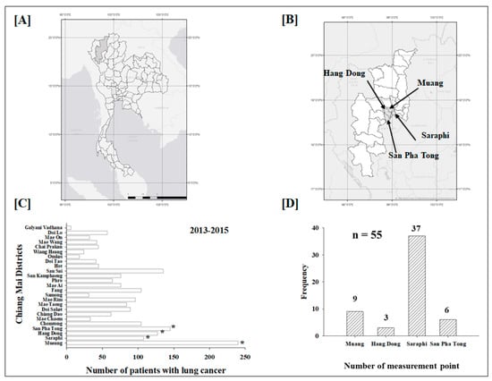 Geological map of the study area located in Upper Northern Thailand. (A) Geographical coordinates in Chiang Mai, Thailand. (B) Map of the study area. (C) Incidence of new lung cancer cases in the total of 25 districts of Chiang Mai from the years 2013 to 2015. (D) Frequency distribution of sampling sites in the study area.