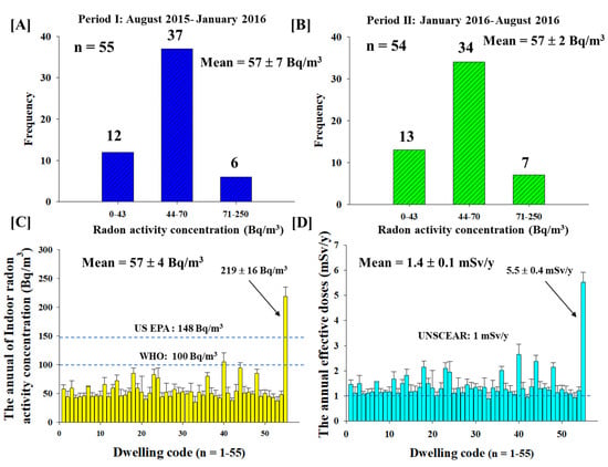 The radon activity concentrations and the effective doses of inhalation. (A) Distribution of the radon activity concentrations in Chiang Mai from August 2015 to January 2016. (B) Distribution of the radon activity concentrations in Chiang Mai from January to August 2016. (C) One-year average of radon activity concentrations in 55 Chiang Mai dwellings. (D) Annual mean effective dose for inhalation dose in 55 Chiang Mai dwellings.