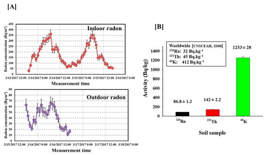 Measurement of radioactivity concentration in air and soil between 13–16 March 2017 in the dwelling with the highest concentration of radon during the fire winter burning season. (A) Temporal variation of radon activity concentrations measured using the AlphaGUARD. (B) Activity concentration of 226 Ra, 232Th and 40K in the studied soil samples.
