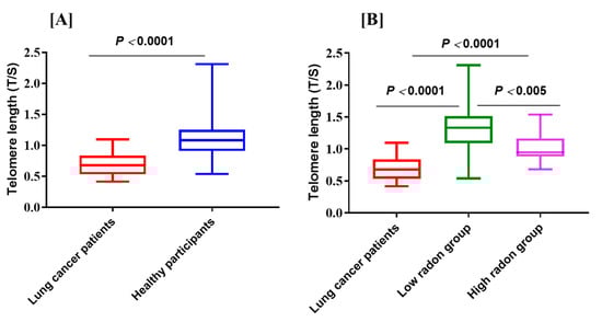The relative telomere length (T/S value) in peripheral blood leukocytes in lung cancer patients and healthy controls with respect to low- and high radon areas. (A) Short telomere length in lung cancer patients. (B) Short telomere length in lung cancer patients as compared with healthy controls with respect to low -and high radon areas.