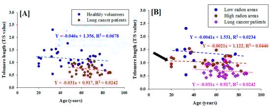 In the last decade, telomere length had been pointed out as a useful for biomarker of biological aging and age-related cancer [13]. In order to further validate our findings, we have performed a linear regression analysis to study the relationship between the mean telomere length (relative T/S ratio) and age in lung cancer patients in nonsmokers and healthy nonsmokers. Our results in Figure 5A show a decrease in the relative T/S ratio in lung cancer patients with respect to age (R2 = 0.0242, y = −0.031x + 0.917). The results confirm that there is an age-dependent reduction of telomere length in patients with lung cancer. Similar trend was also observed in healthy nonsmokers (R2 = 0.0678, y = −0.0046x + 1.356), although the association was stronger in the healthy nonsmokers than lung cancer patients in nonsmokers. When healthy nonsmokers were categorized according to the levels of indoor radon in an individual’s dwelling (Figure 5B), telomere length decreased sharply with respect to age among those with high radon group (R2 = 0.0446, y = −0.0021x + 1.122) than low radon group (R2 = 0.0234, y = −0.004x + 1.531). An interesting finding in this present study is that shorter telomeres in younger individual (age range: 20–24 years) from high radon areas shows an increasing of developing lung cancer during lifetime exposure (Figure 5B, arrow symbol). This is based on the information that the youngest controls whose individual chronic exposure to radon is having increased oxidative stress on the bone marrow stem cells, causing telomere length shortening [31,32,33]. Therefore, short telomere has a correlation with lung cancer risk and leukemia in high residential radon exposure and the association is modulated by age and the cumulative lifetime exposure to radon [13,34,35]. Significantly, future larger studies are needed to entail the in-depth analysis of underlying mechanism of the age differences in the association between telomere length and lung cancer risk with respect to high level of natural radiation background areas.