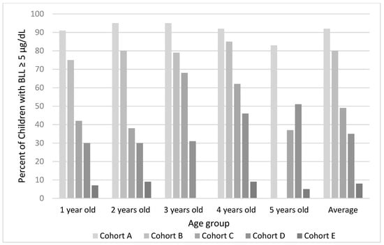 The percent of children with BLL higher than 5 µg/dL decreased significantly as well, from the oldest to the most recent cohort. In cohort A, 92% of children had BLL ≥ 5 µg/dL, whereas only 8% in cohort E had blood lead concentrations over that reference value. Figure 1 shows the change for each cohort stratified by children’s age.