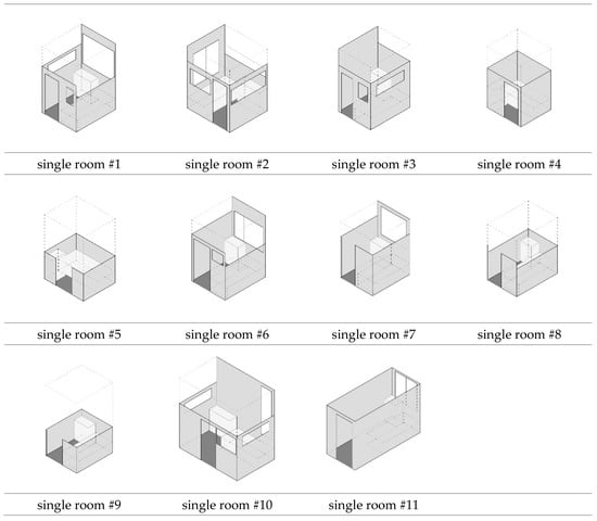The fifth privacy parameter measured in this study, namely personal control, refers to how the residents maintain or control their privacy in the C&A homes. Personal control has been identified as a psychological concept crucial to privacy, and primarily concerns one’s behavior selection [25]. In this study, the personal privacy adjustment level was classified as (2) strong, (1) weak, or (0) non-controllable. Since research into hospital privacy has revealed that rooms with curtain/blinds walls provide significantly less auditory, visual, and overall privacy than rooms with solid walls [26], hard and non-transparent barriers like doors, which the users could operate to carve out private space from the external environment, were classified as providing a strong privacy adjustment level. Soft and transparent barriers like curtains or blinds permitted user adjustment and therefore could provide a relatively private space from the external environment; however, since these still admitted shadows, signs of movement, and the sounds of conversation from outside, these were classified as a weak privacy adjustment level. Finally, a personal chamber without doors, curtains, blinds, or other decorations capable of being used to adjust the privacy level was defined as a non-controllable environment and scored zero points for privacy control.