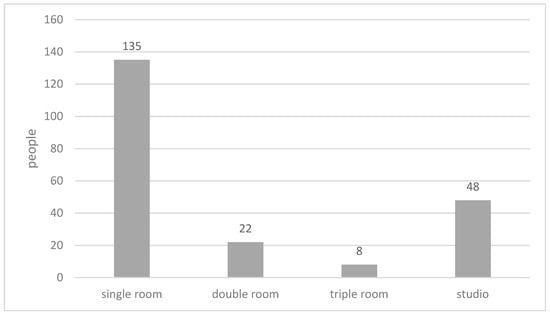 When being asked about their preferred types of bedroom (Figure 7), 63% of the respondents of the total sample indicated that a single room would be their first choice. About 10% respondents of the total sample preferred living in a double room; while 27% respondents of the total sample indicated that they would like to live in a multi-bed studio in a large space. No correlation was found between the age group and preferred room types (Figure 8).