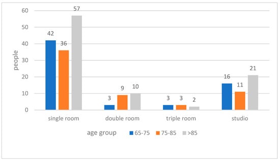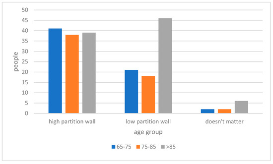 As per the height of partition walls (Figure 9), the majority of respondents expressed a preference for a high partition wall unit, and 40% for a low partition wall unit; only 5% of respondents indicated that they had no preference in this matter. However, a significant portion of respondents who are above 85-year old preferred low partitions (Figure 10). The correlation analysis between age group and preferred height of the partition wall indicated the preferred height of the partition wall decreases as the age of respondents grows (Pearson Correlation: −0.183; p < 0.01).