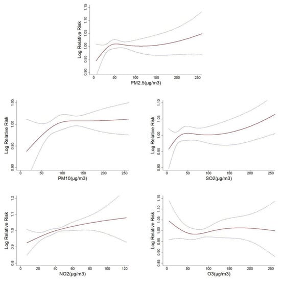 Exposure-response relationships between five air pollutants and respiratory disease hospitalization (The x-axis represented the concentration of air pollutants (μg/m3) at the current day, the Y-axis indicated Log relative risk of respiratory disease hospitalization. The blue imaginary lines were the 95% CI. All models were adjusted for time, temperature, relative humidity, weekend and public holiday.).