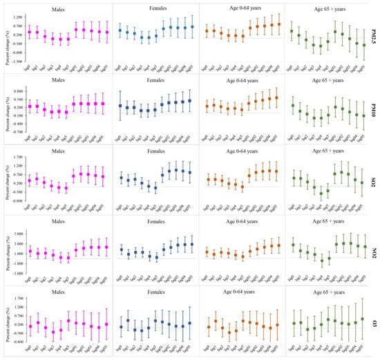 The percent change of overall respiratory disease hospitalization with per 10-μg/m3 increment in single-pollutants by gender and age were shown in Figure 3. For gender subgroups, females suffered more from the adverse effects of air pollutants, with an increasing trend from lag01 to lag05 in multi-day lags. Except for SO2 at lag03 day, the significantly greatest effects values with PM2.5, PM10 and NO2 for female groups were observed at the current day in single-day lags and lag05 days in multi-day lags. For age subgroups, greater percent increase was displayed in younger groups aged 0–64 years, which meant they were more vulnerable to exposure to the air-pollutants, while in single-day lags, only the significant effects for SO2 and NO2 in group aged 65+ years at lag1 with 0.442% (0.021–0.865) and lag0 with 2.662% (1.172–4.173) were greater than those in groups aged 0–64 years. In accordance to overall respiratory disease, the associations between O3 concentration and hospitalization for age and gender subgroups had no statistical significance.