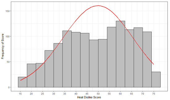 Frequency distribution of the total score on the Heat Dislike survey items with superimposed normal curve. (Note: Higher scores indicate greater dislike of heat).