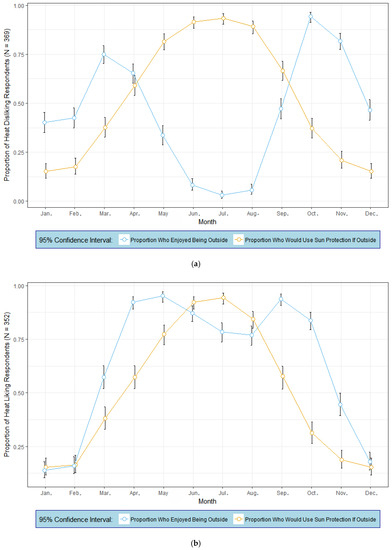 Mean proportions and 95% confidence intervals of respondents who enjoyed being outside (blue profile) and the mean proportion of respondents who would use sun protection if outside (orange profile, by month). (a) Heat disliking respondents (N = 369). (b) Heat liking respondents (N = 352). Note: Sun protection includes behaviors such as seeking shade, wearing sunscreen, wearing protecting clothing, sunglasses, and/or a hat.