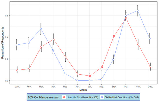 How do people who dislike heat compare with those who like heat with respect to sun-exposure risk-taking? Figure 3 depicts the mean proportions of people from each group (dislike heat and like heat) who enjoy being outside each month and would not take any precautions to prevent sunburn. Consistent with the results in Figure 2a,b, those who disliked heat experienced the greatest risks for over-exposure in the early spring (March and April), and again in the fall (October and November). Those who liked heat experienced the greatest risks for over-exposure from mid-spring (April) to mid-fall (October). From April to September, a dip in both the profiles shows that regardless of heat liking or disliking, there are comparatively smaller proportions of people in each group that are outside and take no sunburn precautions. Nonetheless, a significantly greater proportion of people who liked heat experienced risks for over-exposure compared to those who disliked heat. Further, the risks for over-exposure by heat disliking participants were essentially nonexistent in June, July and August (i.e., the northern hemisphere summer season). It is possible, however, that heat disliking people may experience some risks for over-exposure in the morning before conditions become hot. The reason for this is that UV index at the research location rises above a value of 3 by 9 a.m. in June and July, and by 10 a.m. in August [31].