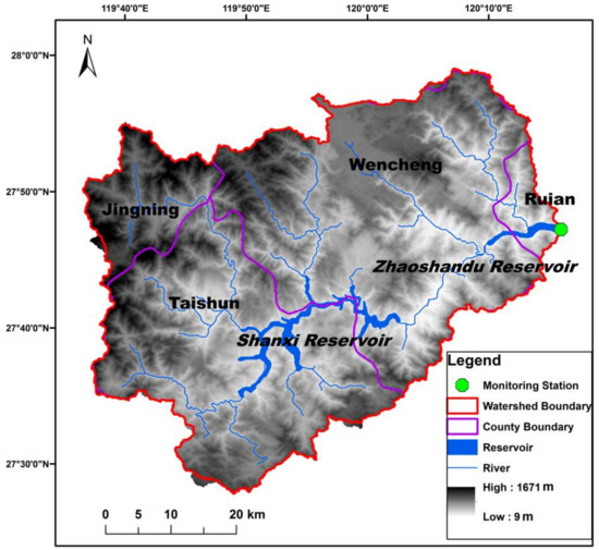 Shanxi Drinking-Water Source Area (SDWSA) is located in the headwaters of the Feiyun River Watershed in Zhejiang Province, China (Figure 1). Total watershed area is 2303 km2 and falls within four administrative counties (Jingning, Taishun, Wencheng, and Ruian). SDWSA is the major drinking water source for ~7 million people and consists of a multi-annual regulating reservoir (Shanxi Reservoir, storage capacity of 1.8 × 109 m3) with a water diversion project (Zhaoshandu Reservoir, storage capacity of 3.4 × 107 m3) located 30 km downstream of Shanxi Reservoir. The watershed has a subtropical monsoon climate with mean annual precipitation of 1870 mm and temperature of 17 °C [24]. Mean watershed elevation is 573 m (9–1671 m) with land use dominated by forest (75%), agriculture (15%), and developed land (8%). The watershed is dominated by highly weathered, iron oxide-rich red soils corresponding to Ultisols/Oxisols in U.S. Soil Taxonomy [25]. Current population density within the watershed is 215 people/km2, which is about 1.5 times the national average (143 people/km2) [23].