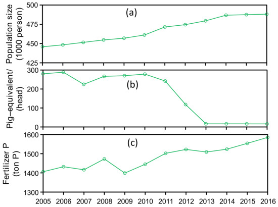 For source apportionment, P from domestic sewage, livestock, and fertilizer accounted for 18.4 ± 0.6%, 30.1 ± 1.9%, and 51.5 ± 1.5% of total anthropogenic P inputs during 2005–2010 compared to 24.3 ± 2.7%, 8.8 ± 10.7%, and 66.9 ± 8.0% for the 2011–2016 period, respectively (Figure 6). Domestic sewage P sources mainly included human excretions and P-containing detergents [4], and therefore were predictably increased due to increasing population within the watershed (445,800 in 2005, 461,000 in 2010, and 488,100 in 2016). Animal waste treatment and reductions in livestock and poultry populations were aggressively promoted after 2010, with areas for livestock and poultry production either banned or subject to a maximum number of livestock (Figure 2). The increased use of P fertilizer over the study period resulted from the local government vigorously promoting agricultural crop production to compensate for the loss of the livestock and poultry industry. For instance, the economic value of agricultural production in Wencheng County more than doubled between 2010 and 2016 (4.87 billion to 9.84 billion RMB). The rapid increase in agricultural crops resulted in an overall increase in P fertilizer use. In spite of the large increase in P fertilizer use in SDWSA, overall anthropogenic P inputs decreased by 21.5% over the study period.