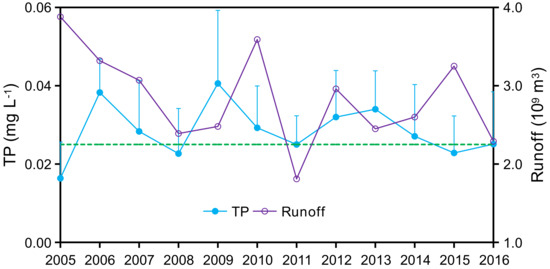 Annual runoff volume and annual average total phosphorus (TP) concentrations in Zhaoshandu Reservoir (2005–2016). The vertical error lines are the standard deviation of TP, and the horizontal dotted line represents the Grade II water quality standard goal for TP (0.025 mg/L).