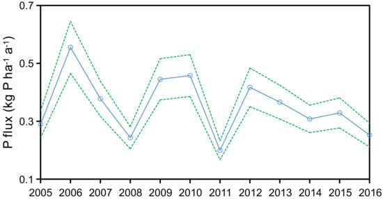 Annual P flux exported from Zhaoshandu Reservoir during 2005–2016. Dotted lines denote the 95% confidence interval obtained from Monte Carlo simulation.