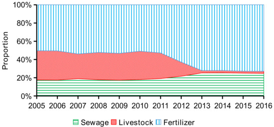 The major anthropogenic P inputs to SDWSA were domestic sewage, livestock excrement, and phosphorus fertilizer. The annual P source inputs during 2005–2016 are shown in Figure 5. Inputs of P from livestock decreased appreciably after 2010, yet P inputs from domestic sewage and fertilizer both increased with time. Source strengths of P from sewage and fertilizer increased from 2.24 and 6.17 kg P/(ha·a) in 2005 to 2.47 and 6.98 kg P/(ha·a) in 2016, respectively, equivalent to increases of 10.4% and 13.2%, respectively. In contrast, the source strength of P from livestock waste decreased from 3.92 kg P/(ha·a) in 2005 to 0.23 kg P/(ha·a) in 2016, a decrease of 94.3%. Overall, the net changes in anthropogenic P inputs decreased from 12.3 to 9.7 kg P/(ha·a) over the 12-year study period.