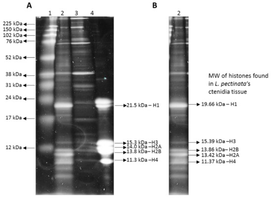 Discontinuous SDS-PAGE gel with isolated histones from Lucina pectinata’s ctenidia and mantle tissues. (A) Lane 1—Broad Range rainbow protein ladder (Amersham), Lanes 2 and 3—histones from L. pectinata tissue; (2) ctenidia; (3) mantle; (4) histones from Calf Thymus (Sigma). (B) Lane with histones extracted from L. pectinata ctenidia (lane 2 in section A) with the predicted molecular weights of H1, H2A, H2B, H3 and H4.