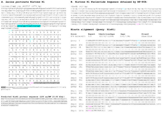 Histone H1_A sequence found in Lucina pectinata genome assembly. (A) One of the two H1-like nucleotide sequences obtained from the BLASTN searches against the L. pectinata genome assembly using the H1 nucleotide sequence from S. marginatus is shown, including the coding region, the predicted protein sequence and its molecular weight (MW). (B) The nucleotide sequence obtained by Sanger sequencing of RT-PCR products followed by the BLASTN alignment of the cDNA to the genomic sequence, showing a perfect match between the two sequences. Primers used in RT-PCR are highlighted in cyan and grey. Start (cyan) and stop (pink) codons are indicated.