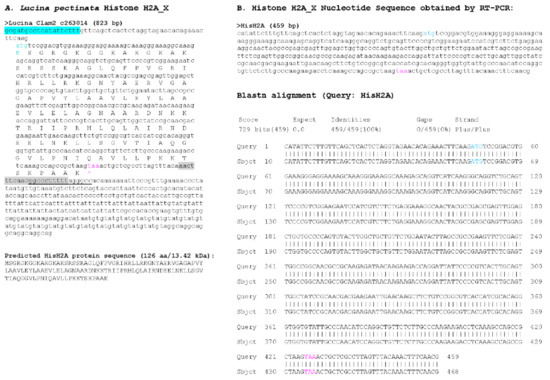 Histone H2A_X sequence found in Lucina pectinata genome assembly. (A) One of the four H2A-like nucleotide sequence obtained from the BLASTN searches against the L. pectinata genome assembly using the H2A nucleotide sequence from S. marginatus is shown, including the coding region, the predicted protein sequence and its molecular weight (MW). Primers used in RT-PCR are highlighted in cyan and grey. Start (cyan) and stop (pink) codons are indicated. (B) The nucleotide sequence obtained by Sanger sequencing of RT-PCR products followed by the BLASTN alignment of the cDNA to the genomic sequence, showing a perfect match between the two sequences.