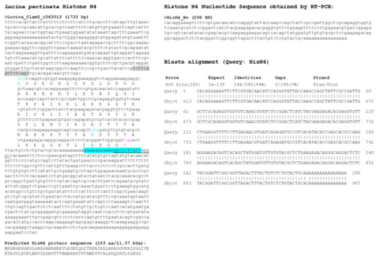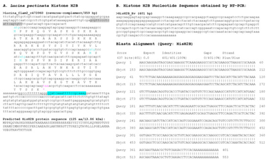 Histone H2B sequence found in Lucina pectinata genome assembly. (A) Histone H2B nucleotide sequence obtained from the BLASTN searches against the L. pectinata genome assembly using the H2B nucleotide sequence from S. marginatus is shown, including the coding region, the predicted protein sequence and its molecular weight (MW). (B) The nucleotide sequence obtained by Sanger sequencing of RT-PCR products followed by the BLASTN alignment of the cDNA to the genomic sequence, showing a perfect match between the two sequences. Primers used in RT-PCR are highlighted in cyan and grey. Start (cyan) and stop (pink) codons are indicated.