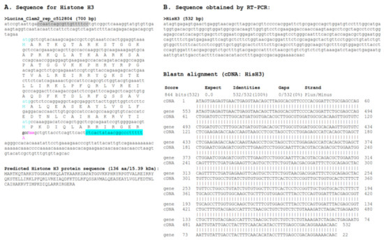 Histone H3 sequence found in Lucina pectinata genome assembly. (A) The H3 nucleotide sequence obtained from the BLASTN searches against the L. pectinata genome assembly using the H3 nucleotide sequences from S. marginatus and the partial coding region sequence of H3 from L. pectinata is shown with the ORF translation, the predicted protein sequence and its molecular weight (MW). (B) The sequence obtained by Sanger sequencing of RT-PCR products by the BLASTN alignment to the genomic sequence, showing a perfect match between the two sequences. Primers used in RT-PCR are highlighted in cyan and grey. Start (cyan) and stop (pink) codons are indicated.