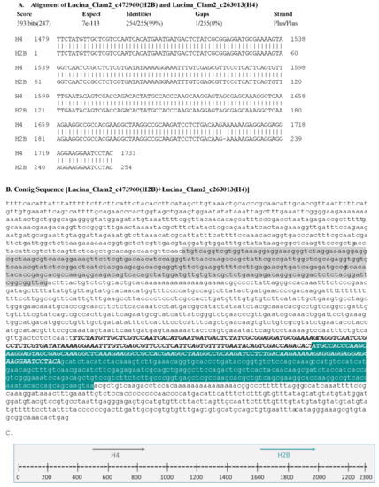 The H4 gene precedes the H2B gene in the Lucina pectinata genome. (A) BLASTN analysis between sequences containing the H4 and H2B genes obtained from the draft genome show an overlap of 255 bp, suggesting these two sequences can form a larger contig. (B) The contig containing the H4 and H2B genes resulted in a 2337 bp long sequence. The H4 coding region is highlighted in gray and the H2B coding sequence is highlighted in teal. The common overlapping region of 255 bp is indicated in bold/italic uppercase letters. (C) Schematic representation of the H4 (gray colored arrow) and H2B (teal colored arrow) genes localization, arrows indicate the direction of transcription (5′→3′).