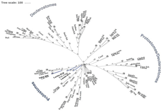 We built a phylogenetic gene tree using the Maximum Likelihood Method (ProML) (PHYLIP) [19], and the results were visualized using the iTOL server [20]. As shown in Figure 11, our query sequences have a common ancestor that is closer in evolution to other marine organism, insects and birds. The results show that our query sequences are also related to the S. marginatus H1 protein, as expected, and to other bivalves or marine organisms (such as: sponges, mussels, other clams, oysters, octopus, crabs). L. pectinata H1_A and H1_B proteins are close in relationship with other protostome organisms (other mollusk, insects and worms). In comparison with studies of the razor clam Solen marginatus [1], another bivalve mollusk, our tree shows some similarities in evolutionary relationships between protostomes and deuterostomes as shown in Figure 10. Additionally, we can assume that the L. pectinata H1 proteins have a common ancestor not only with one another but also with S. marginatus, this relationship is represented in clades, which determine all the descendants of one common ancestor. Furthermore, comparing L. pectinata’s proteins with those from S. marginatus, H1_B from L. pectinata has a closer evolutionary relationship than H1_A to the S. marginatus H1. It is interesting that both H1_A and H1_B are both outgroups of their respective nodes. This finding suggests that H1_B is more evolved than H1_A, and also that H1_A has reached its highest evolutionary point in contrast to H1_B which kept on developing like the H1 from S. marginatus. As a summary of the results obtained for our phylogenetic analysis, our query proteins have an evolutionary relationship with other protostome organisms, but in contrast, they are farther apart in evolution from deuterostome organisms (including mammals). We can only assume that these proteins have evolved differently depending on the organism and also on the environment they are exposed to. Further studies of invertebrate hemoglobins are needed to better understand the evolution of histone H1, in addition to the evolution of histone H2A and its variants among species.