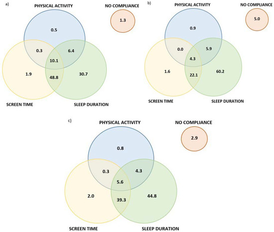 Venn diagrams showing the percentage of pre-school children (not) complying with the recommendations for physical activity, screen time, and sleep duration, and combinations of these recommendations, for (a) weekdays; (b) weekend days; and (c) overall. The sum of each circle is equivalent to the percentage of pre-school children meeting the individual recommendations (e.g., 17.3% for physical activity on weekdays).
