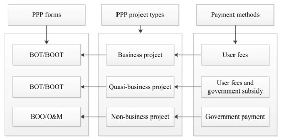 In China, the first PPP project was perhaps the Laibin B power station, where a foreign firm from the private sector took part in the project [33]. In order to regulate and stimulate the private sector to enter into the public sector, the NDRC and MOF acted as the supervisors and stated that PPP model could be applied to public facilities, which includes transportation, environmental protection, gas, water, power, heat, waste treatment, hospital, and education. The NDRC also suggested a guideline for PPP forms in order to give advice from the public sector in choosing the proper forms to submit with an application (Figure 1), such as the Build–Operate–Transfer (BOT), Build-Own-Operate-Transfer (BOOT), Transfer-Operate-Transfer (TOT), and Operations & Maintenance (O&M) forms. There are other popular PPP forms around the world, such as the private finance initiative (PFI) in the U.K., the concession form in France, and the private participation in infrastructure (PPI) form of the World Bank. Figure 1 shows that public sector chooses a PPP form for a specific project depending on the payment method.