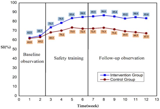 Four weeks of safety training and six weeks of behavior observation were carried out for the control group and the intervention group. As shown in Figure 4, the total SI scores of the intervention group and the control group during the two-week baseline were 62.5 and 61.8, respectively. After safety training, SI increased to a maximum of 86.6 and 73.3, respectively. Without further intervention, this SI decreased during the follow-up observation phase to 83.4 and 67.3 at the end of the 13th week, respectively. Finally, the SI improved 20.9 and 5.5, respectively.