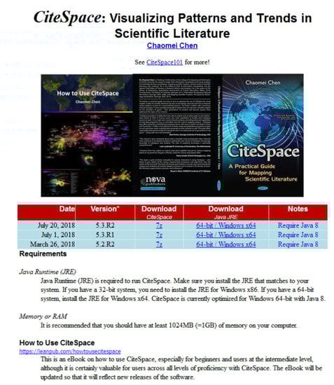 The CiteSpace software is important analysis and visualization tool in scientometrics domain. CiteSpace was designed by Chen for progressive knowledge domain visualization [79]. It focused on finding critical points in the development of academic domains, especially intellectual turning points and pivotal points [80]. The latest version of CiteSpace is 5.3.R2 SE for 64-bit Windows with Java 8, and the software download home page was optimized on 20 July 2018 [81]. As free software, CiteSpace software can be downloaded from the website (http://cluster.ischool.drexel.edu/~cchen/ citespace/download/). The download interface of CiteSpace software is shown in Figure 1.