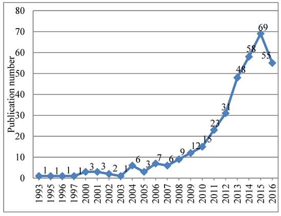 Figure 2 shows the current state of urban resilience research and shows the distribution of 355 document records for 39 journals related to urban studies in the WOS core database from January 1, 1993 to December 31, 2016. The publication number per year related to urban resilience presents discontinuous characteristic and only has a very small number before 2000. Then, the total number of annual publications related to urban resilience in the WOS presents slight increasing and fluctuation trend between 2000 and 2010. Since then, it has grown steadily since 2010, and the number of publications reached its peak in 2015. Figure 2 details the annual number of publication on urban resilience research.