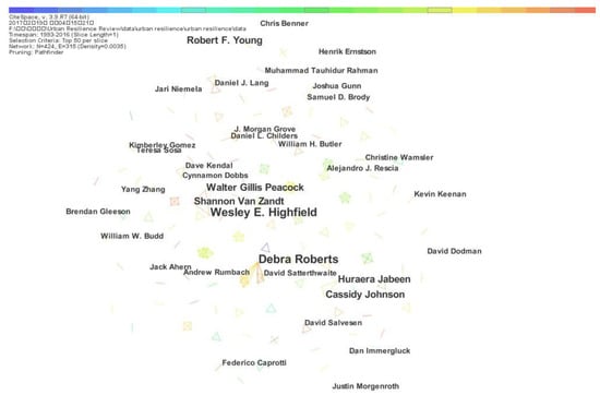 Figure 3 reveals the outputs and co-author relationships of leading authors in urban resilience research. The size of the authors’ nodes presents a positive correlation to the numbers of authors’ publications. The thicknesses of lines between authors indicate the levels of the collaborative relationships in a given year. The different colors of links represent different phases during January 1993 to December 2016. Figure 3 shows that the most productive authors in the domain of urban resilience research are Wesley E. Highfield, Associate Professor at the Department of Marine Sciences at Texas A&M University and Deborah Roberts, Professor at the Department of Environmental Planning & Climate Protection at EThekwini Municipal, followed by Shannon Van Zandt, Walter Gillis Peacock, Robert F. Young, Huraera Jabeen and Cassidy Johnson. Table 1 lists the authors who have most publications on urban resilience research in recent years.
