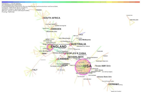 The authors’ countries and institutions form a collaborative relationship network which reflects the collaborative relationship between countries and institutions. To characterize the collaborative relationship of publications on urban resilience, CiteSpace is used to form this collaborative relationship network. According to the publication frequency, nodes represent different countries and institutions in collaborative relationship network, the links represent the collaborative relationship between different countries and institutions on urban resilience research. The academic collaborative relationships between countries and institutions on urban resilience research are shown in Figure 4.