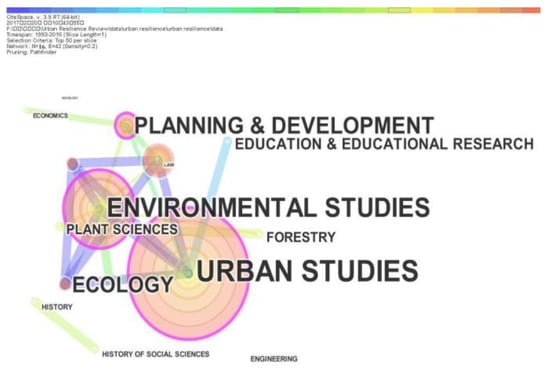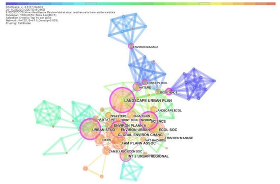 According to the co-citation frequency, most of journals with high influence are journals from among the 39 journals related to urban studies in the WOS core collection database, including Landscape and Urban Planning, Urban Studies, Journal of the American Planning Association, Environment and Urbanization, International Journal of Urban and Regional Research, Cities and Habitat International. These journals all belong to the top 11 journals source listed in Table 4. However, some journals have fewer cited frequency and show lower influences than the top 11 journals listed in Table 4, such as European Planning Studies, Urban Forestry & Urban Greening, Education and Urban Society and Urban Education. Science and Nature are also journals with high influence on urban resilience research, which means that urban resilience has caused widespread concern in international academic fields. Other journals with high influence focus on general resilience research, such as Global Environmental Change and Ecology and Society.
