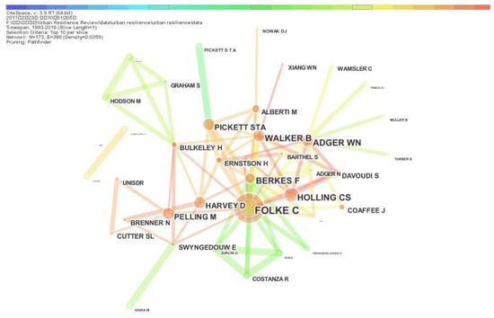 Author co-citation analysis is an efficient method to measure relationships and connections between authors and to describe mainstream, or at least the leading edge, in the collaborative structure of urban resilience research. In this section, we identify and analyze the evolutionary trends of authors whose scientific papers are cited in the same paper and community of science. Consider a co-citation network with multiple nodes, selecting the first ten tabs of the first slide as the node selection criteria in this section. The author co-citation network is shown in Figure 8, which contains 173 author nodes and 412 co-citation links. In author co-citation network, the size of each node reflects co-citation frequency between authors, and the link represents an indirect collaborative relationship between authors. Some scientific communities have significant co-citation relationships in author co-citation network.