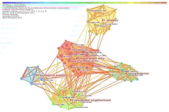 Co-citation analysis provides a unique insight into the structure and dynamics of the scientific paradigm. As a way to measure the proximity between documents, co-citation analysis is a good way to show the relationship between source articles in a dataset and corresponding citations in a wide range of external reference records [92]. Co-citation analysis includes co-citation analysis of journals, co-citation analysis by authors, and co-citation analysis based on citations [93]. In addition to the above three co-citation analysis, cluster analysis is also used to detect and identify changes in development trends in different periods, and to clarify the relationship between important turning points and urban resilience research trends.