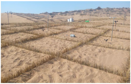 According to China’s desertification and sandy status bulletin, China’s desert area in 2014 was 261.16 million km2, accounting for 27.20% of the total land area. The sandy land area was 172.12 million km2, accounting for 17.93% of the total land area [1], with wind erosion being the main process responsible for soil degradation and desertification [2,3]. Straw from wheat, rice, and other plants is placed in the shape of a checkerboard, with one half buried in the sand and the other half exposed (Figure 1), typically to a height of about 20 cm. Straw checkerboards form squares of various sizes, with sides of 1.0, 2.0, or 3.0 m. Due to their low cost, ease of use, and convenient and effective features, straw checkerboards have been widely used in desertification prevention and windblown sand control in China [4]. Straw checkerboards were first used in the northwest windy sand area and have become one of the most widely-used and well-applied engineering measures to control soil erosion throughout the country [5]. In addition, straw checkerboards have played an important role in the construction of railways, pipelines, expressways, and power transmission lines [6], and their use has been extended to Africa, Eastern Asia, and Mongolia [7].
