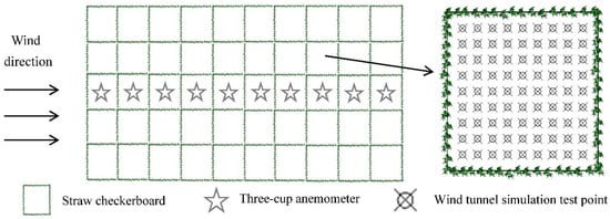 To analyse the wind speed distribution in the straw checkerboard grid, we constructed a model with lengths of 10, 20, and 30 cm, while maintaining a ratio of 1:10 between the wind tunnel model and the actual checkerboard in the field. According to the wind speed gradient, we set the wind speed to 5, 8, or 11 m·s−1.