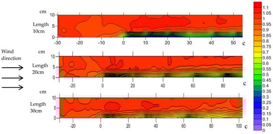 The airflow velocity distribution across the different sizes of straw checkerboard is shown in Figure 4. The positive coordinate on the horizontal axis represents the leeward side of the straw checkerboard and the negative coordinate indicates the windward side of the straw checkerboard. The gap between adjacent contour lines is 0.2 m·s−1. The wind speed, before it reached the sand barrier, had a certain functional relationship with height, with a positive correlation between wind speed and height. The wind velocity profile was altered as it passed over the sand barrier, but it still displayed changes with height. The airflow uplifted when it encountered the sand barriers, and the wind speed within the straw checkerboard reduced, but it increased sharply above the sand barrier. In the 10-cm-long straw checkerboard, the wind speed fluctuated substantially over the height range of 0–5 cm. The wind speed clearly decreased near the sand barrier at a height of 0–2 cm, while in the height range of 2–5 cm, the wind speed increased sharply. In the height range of 5–10 cm, little change in wind speed occurred, with values being higher than the original wind speed, indicating that the airflow was stable in this area, and that the wind speed did not change with height. The wind speed distribution over a 20-cm-long straw checkerboard was similar to the wind speed distribution over a 10-cm barrier. The wind speed behind the barrier was lower than the original wind speed over the height range of 0–2 cm. Over the height range of 2–5 cm, the wind speed was affected by an upwelling airflow when it passed through the sand barrier, and the original wind speed was then restored. The wind speed also accelerated in the height range of 5–10 cm after it passed over the sand barrier, and the air flow became relatively stable. In this region, the wind speed was higher than the original value. The wind speed in the height range of 0–2 cm over the 30 cm straw checkerboard decreased after it passed through the sand barrier and then remained relatively stable. In the height range of 2–10 cm, the wind speed increased with the upwelling air flow through the sand barrier, and then decreased to the original value.